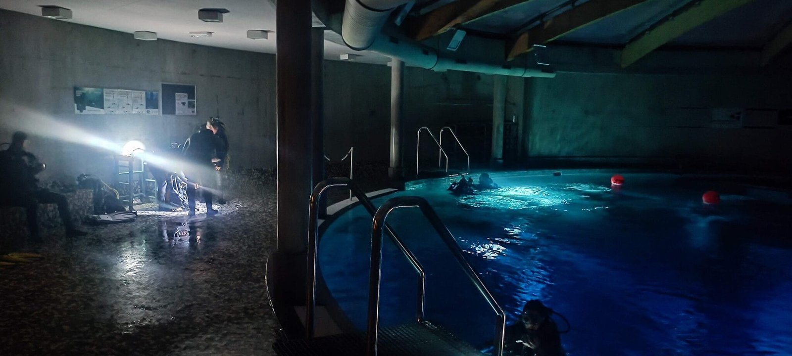 We verkennen de duiktank in een totaal andere sfeer. Tijdens de ‘winter-black-out’ gaan alle lichten uit. We duiken dus in het donker met enkel het licht van onze duiklamp.